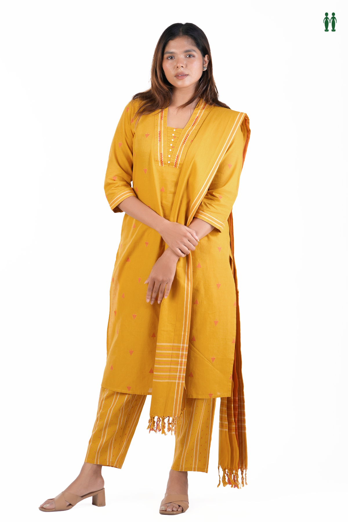 Elevate your everyday wardrobe with this refined V-neck salwar set, crafted from premium cotton in a luminous golden yellow. The intricate threadwork design adorning the neckline adds an understated elegance, making it perfect for both casual gatherings and semi-formal occasions. The breathable cotton fabric ensures comfort throughout the day, while the classic silhouette flatters all body types.Â