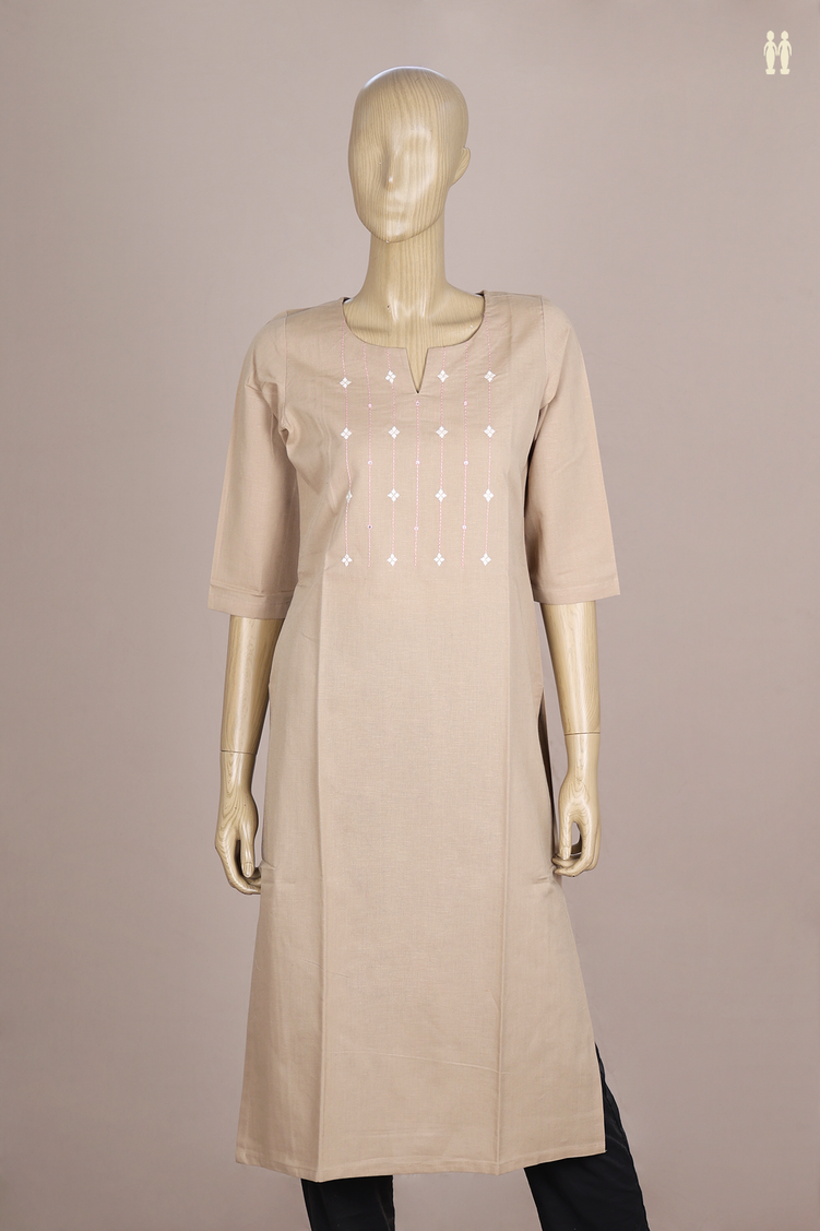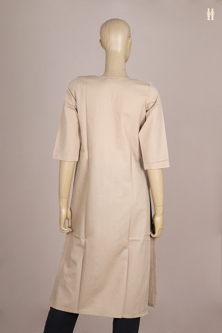 V-Split Neck Threadwork Design Khaki Linen Long Kurta