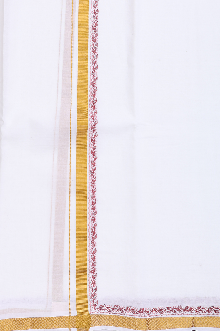 Elevate your traditional wardrobe with this refined white cotton dhoti, distinguished by its intricate zari border detailing. Crafted from premium cotton for breathability and comfort, this timeless piece seamlessly blends classic elegance with contemporary styling. The lustrous gold zari embroidery along the edges adds a touch of opulence, making it ideal for festivals, celebrations, or formal occasions. Perfect for those who appreciate authentic ethnic wear with a sophisticated edge.